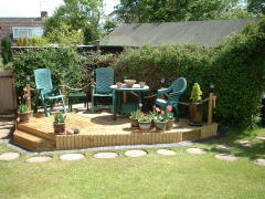 | Plants that do well are firethorn, rhododendrons, cornus, hypericum, buddlias, clematis, cotoneasters, rock roses, eleagnus and lavender. The size of the garden was a huge influence on us when we bought the house in 1974 and we are now concentrating on improving some of the hard landscaping. The Apple Tree did die in July 2002 so we have constructed a Japanese Patio from where we can sit and look down the garden (picture below). We love bright colours so are "unfashionable" and keep our summer bedding! In September 2003 Rol dug out the border by the hedge near the Round House and this has now become a new herbaceous border. One more bonus: we can go out of